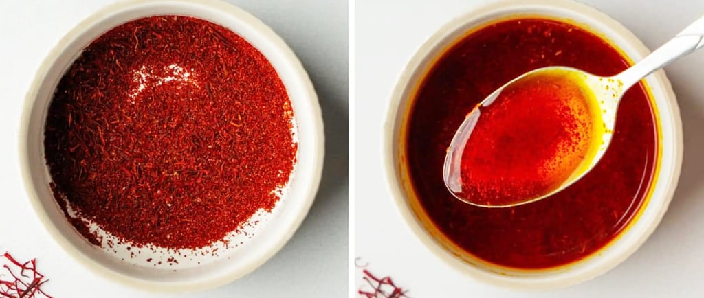 Depois de triturar, é hora de liberar toda a essência do açafrão. Como mostrado na imagem à direita (número 2), adicione o pó em uma pequena quantidade de água quente (não fervente) e deixe descansar por 5 a 10 minutos. Durante esse tempo, a água irá absorver o sabor, o aroma e a cor intensos do açafrão. Esse líquido é conhecido como "infusão de açafrão" e pode ser usado em várias receitas, como risotos, sopas, molhos e sobremesas.